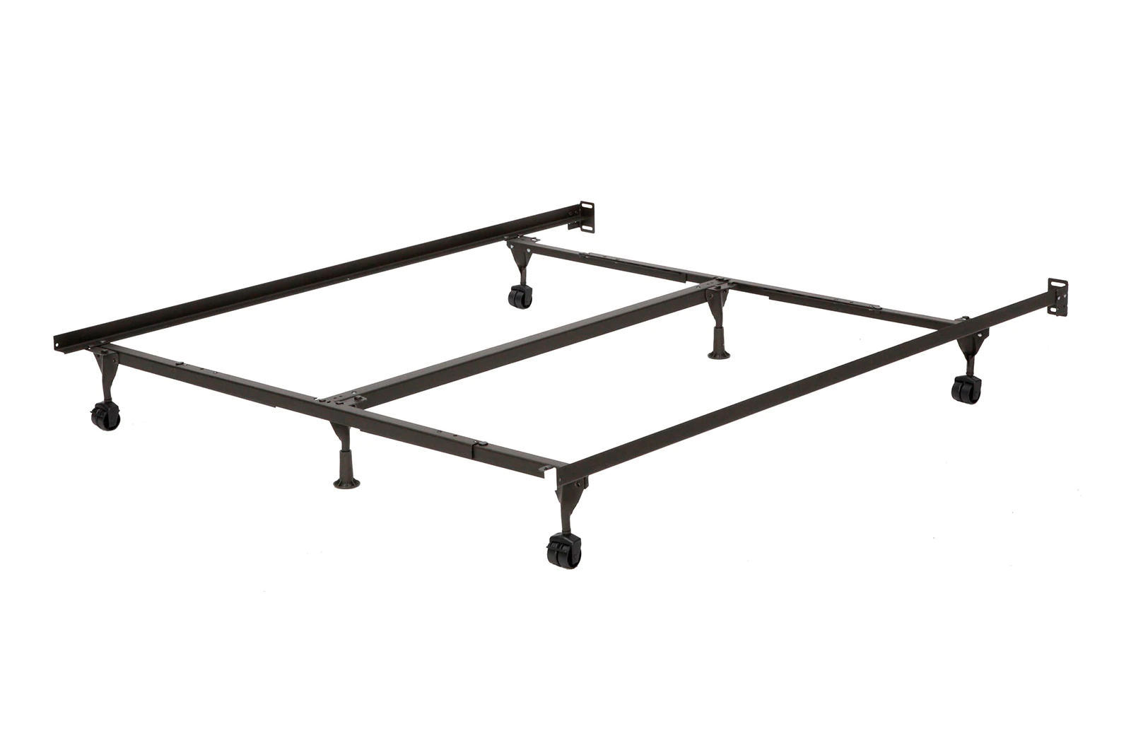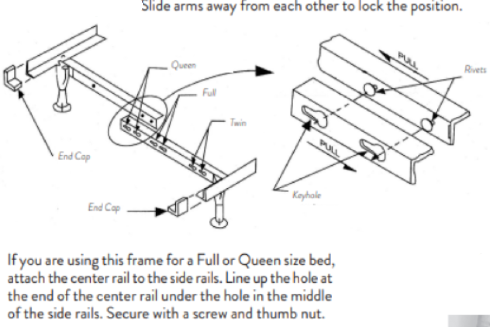 of keyholes and rivets must be selected. Slide arms away from each other by pulling apart to lock the position. Common sets of bed frames are 3-in-1 (King/Queen/Full. Qeen/Full/Twin, or King/California King/Queen) and 2-in-1 ITwin/Full)
