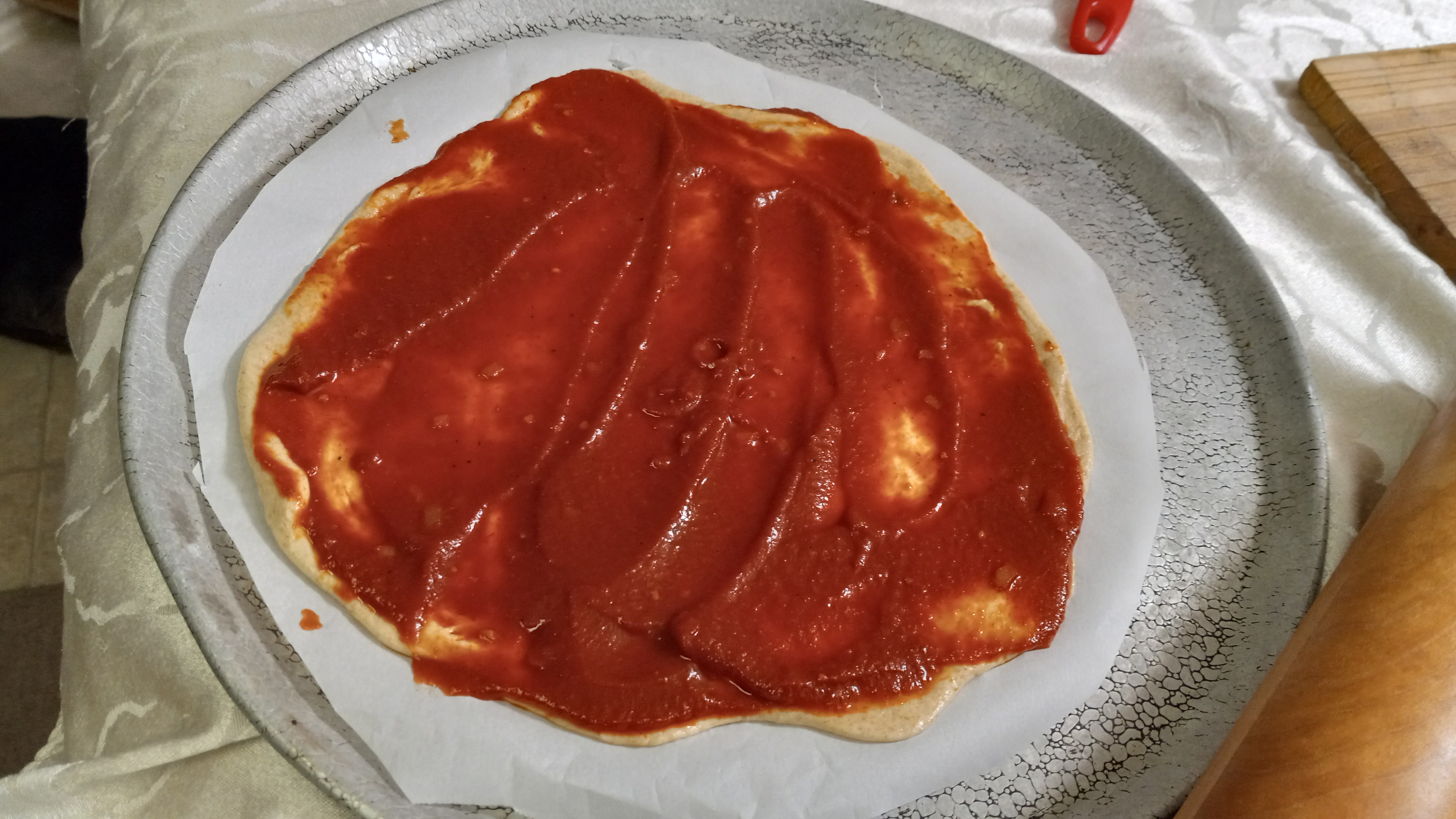 *If your parchment paper roll only had 3 inches left, you can use foil but make sure to lift the crust and separate from foil slightly without tearing before spreading the sauce. No foil? Spread cormeal or some crisco or oil on pizza pan