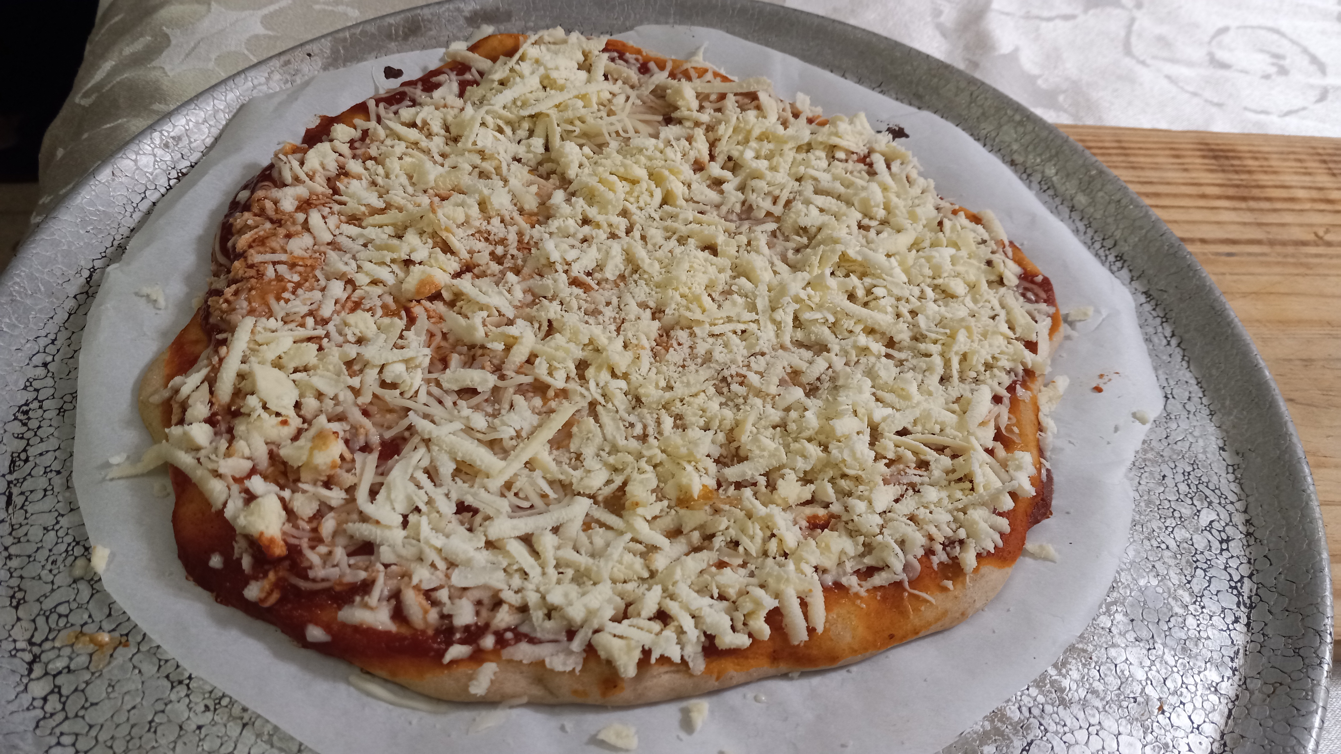 1. Preheat oven 475F. Roll out dough circle approximately 1/4 inch thick (the thinner-the crunchier) on parchment paper, spread the tomato sauce (amounts vary, my son loves saucy so I make almost a quater-inch layer with sauce). For pizza sauce types, it will take figuring out your personal preference. My kids love when I use Ragu Old Fashioned Traditional jar spagetti sauce, no chuncks, no overpowering herb flavor, no guessing if too much salt or sugar (Prego brand is too sweet) but my husband and I prefer little amount of sauce made of a mix of crushed tomatoes with a little tomato paste with fresh basil, oregano, and garlic but carefull not to oversalt. Spead your toppings (but not cheese yet).