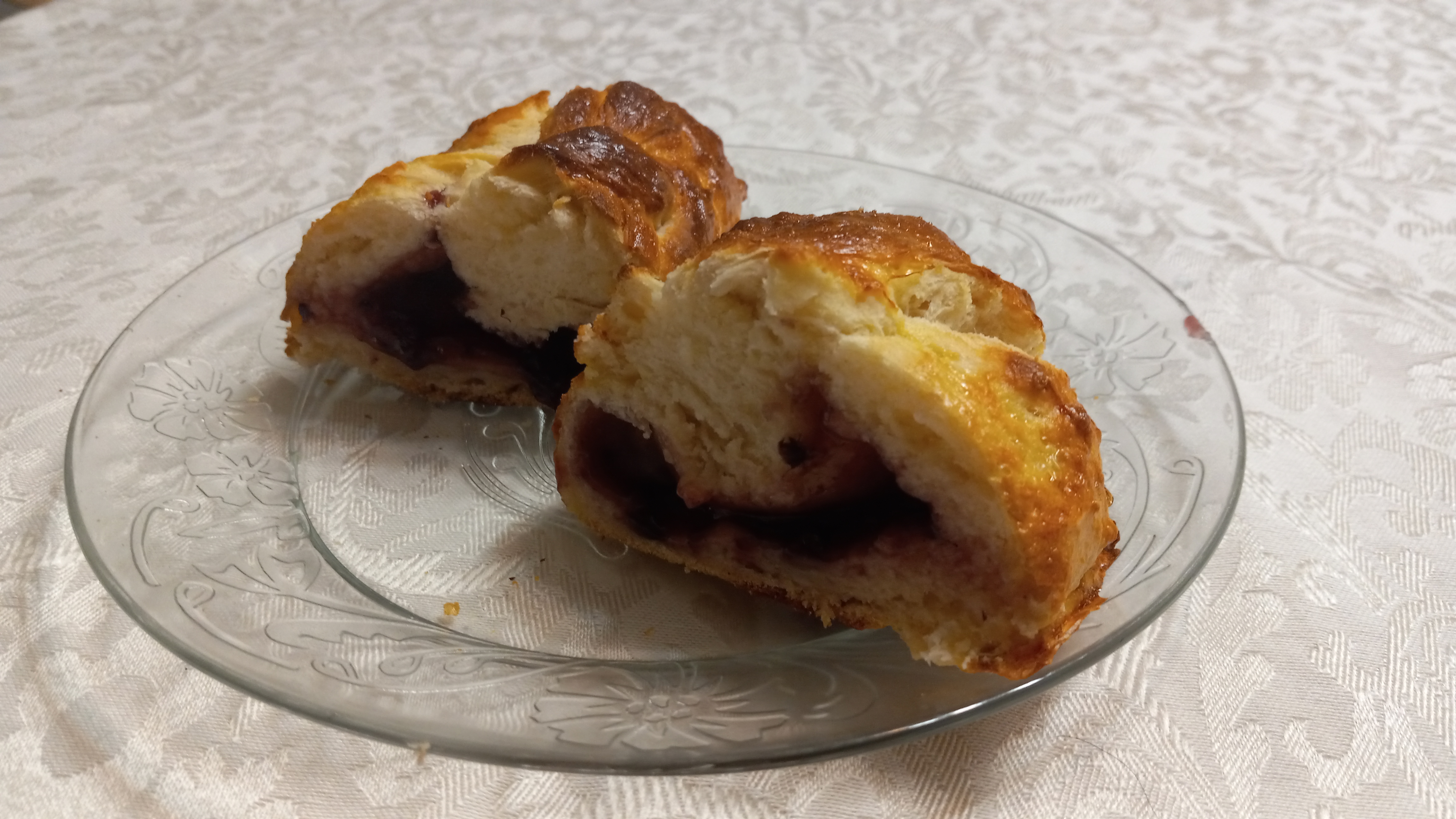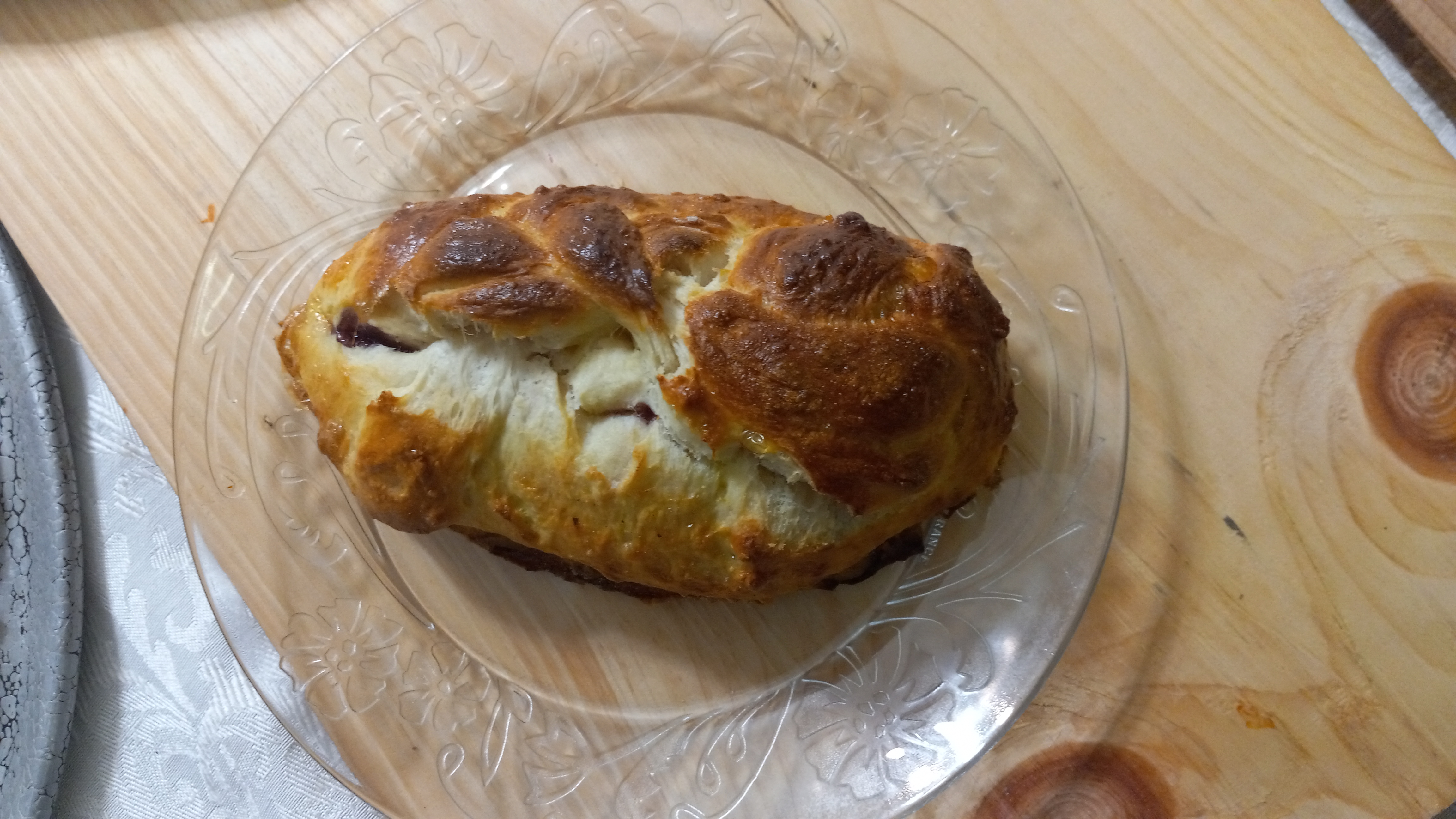 1. Preheat oven 350F. Roll dough to 1/4 inch thick circles approximately 6 inches in diameter. Place filling in the center and seal edges after folding in half (forming D-shape). If filling is runny, add flour or cornstarch to jelly or jam. You can stuff dry fruits and berries, cream cheese with powdered sugar, pumpkin with cinnamon, etc. Do not overfill to prevent tearing when wrapping.