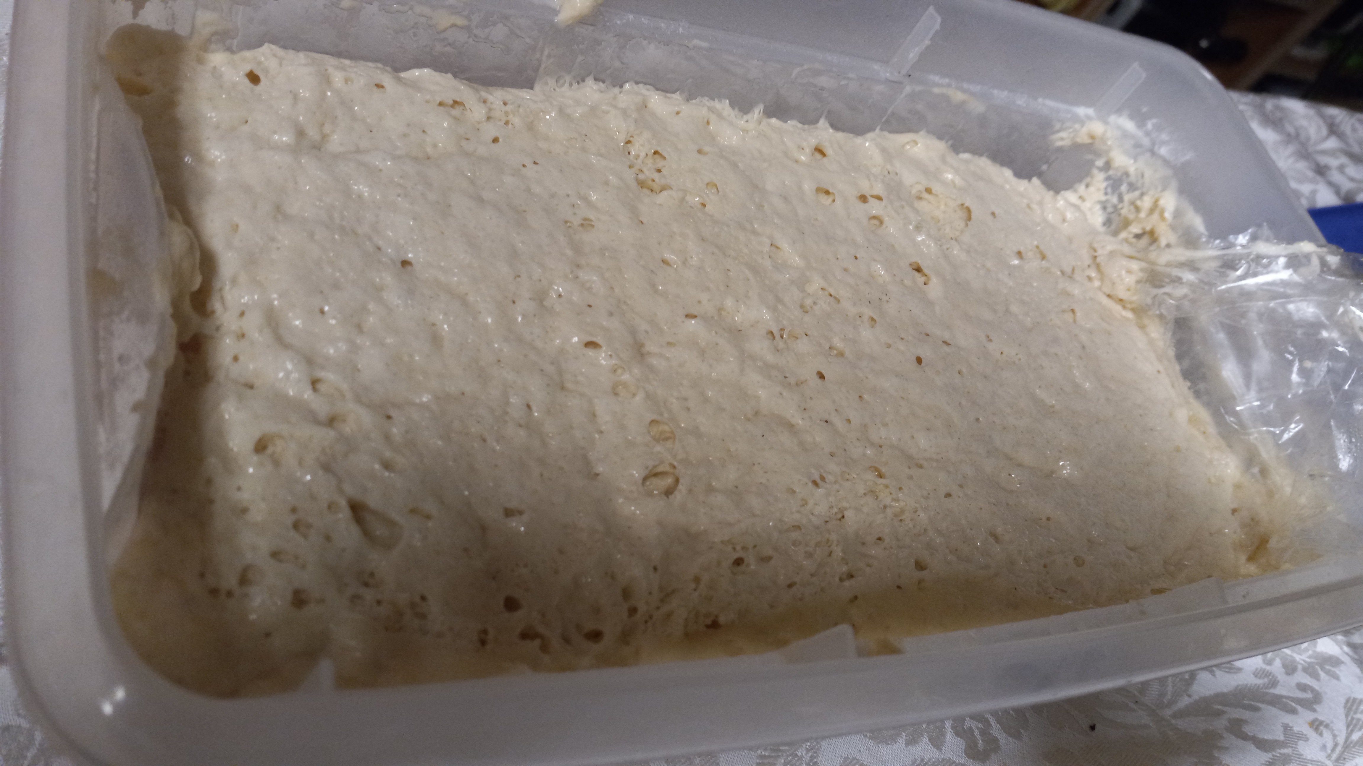 6. Leave on the counter 1-2 hours and then put into the refrigerator for up to 48 hours. Freeze if not used up after 2 days. The sour taste in the baked bread/crust will be evident if left in the fridge 3-7 days.