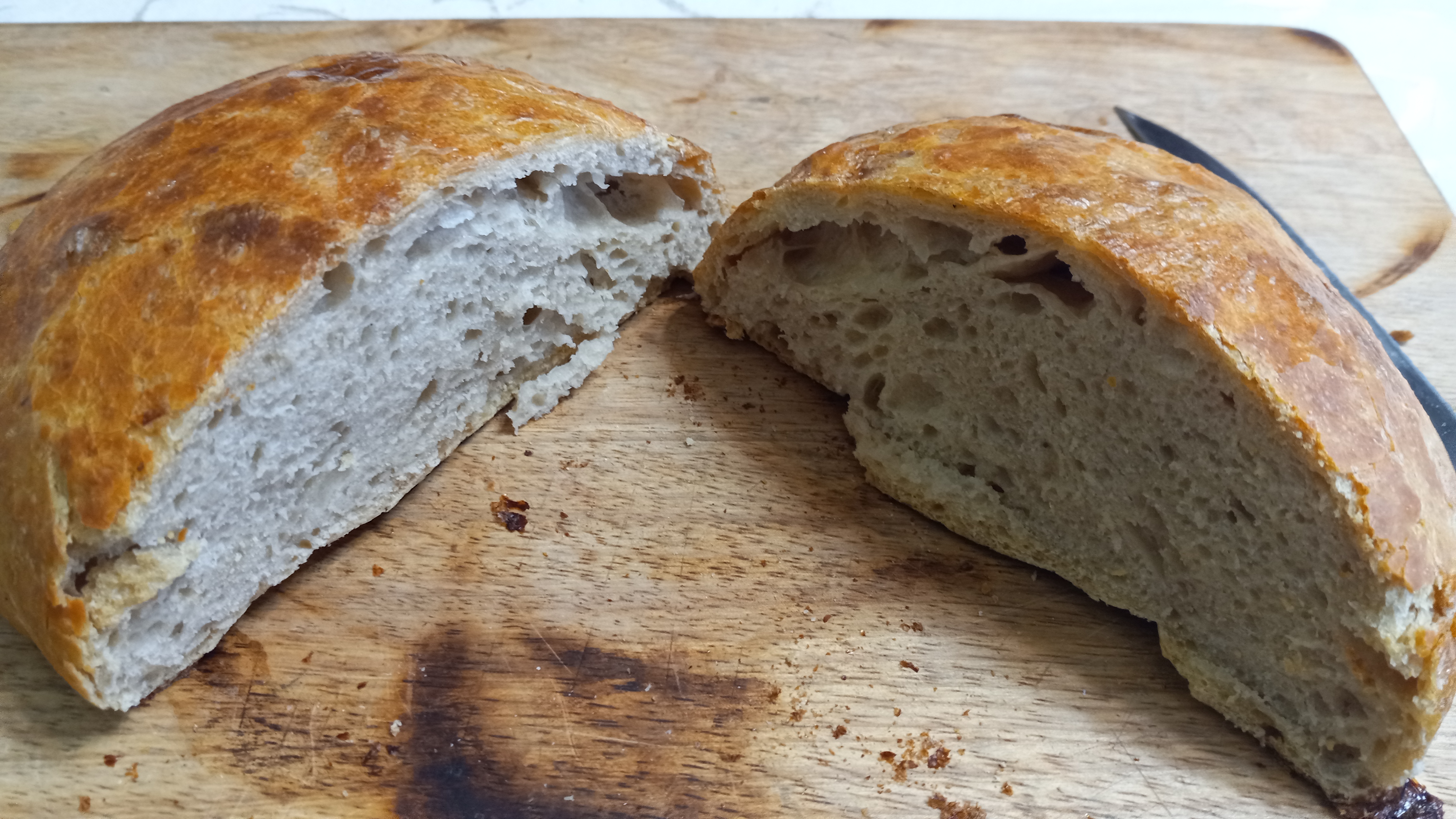 4. For a chili bread bowl, bake time will vary depending on the size formed. You can also bake these in the cast iron pan at 425F with the lid on for the first half of the bake time and without the lid for the remaining 20-30 minutes.